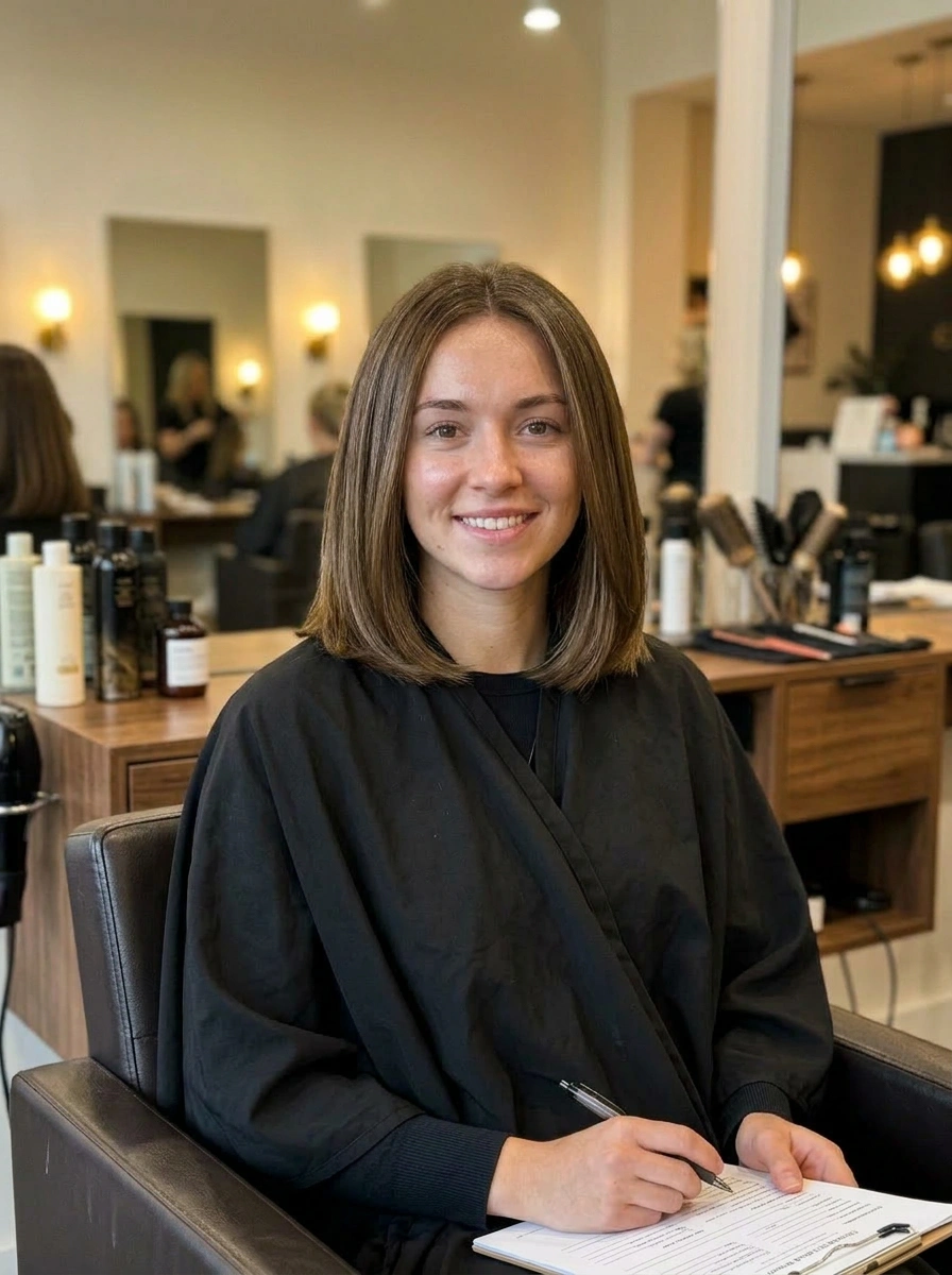 Close-up salon consult photo with the current natural brunette tone.